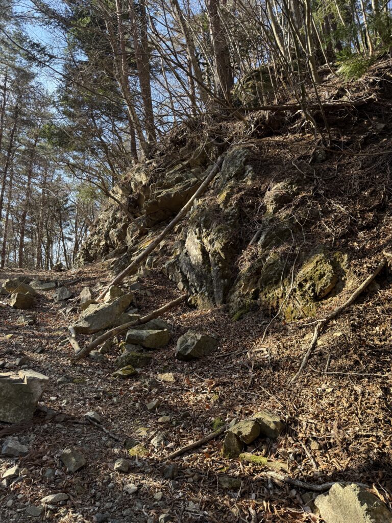 距離は短いですが足場がかなり不安定な岩場の急斜面で、雨のあとなどは滑りやすそうな場所です。