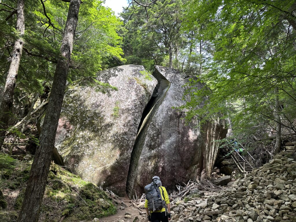 しばらく進むと富士見平小屋に到着。ここは瑞牆山と金峰山の分岐点でもあり、休憩ポイントとしても人気の場所です。ベンチで少し水分補給をし、ここから本格的な登りへ。道は次第に岩が増え、木の根や段差も多くなります。両手を使う場面もあり、いわゆる「登っている感」が強くなってきました。
