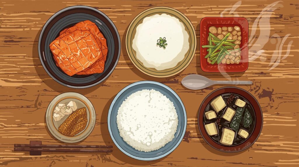 • 自宅では「豆腐+納豆」「鮭の焼き魚」「味噌汁+ご飯」などバランス食