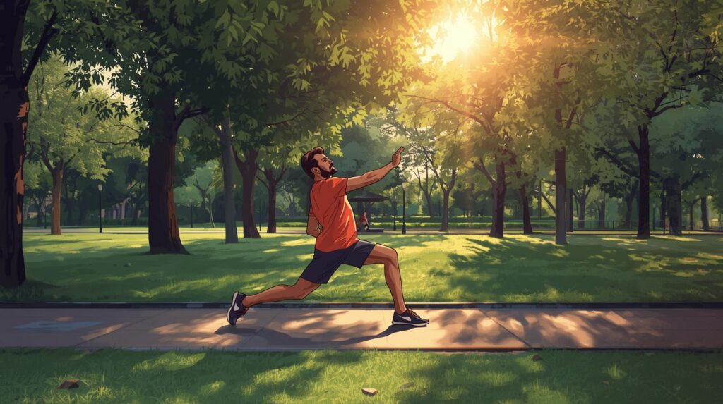 • 太もも前側(大腿四頭筋):片足を後ろに引き、膝を軽く曲げて伸ばす